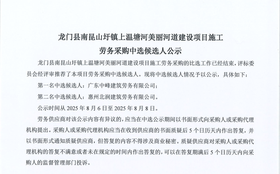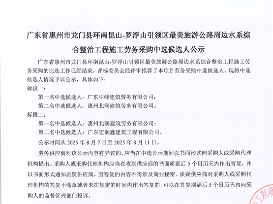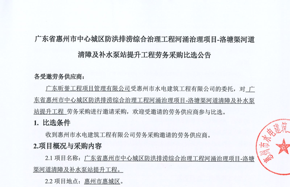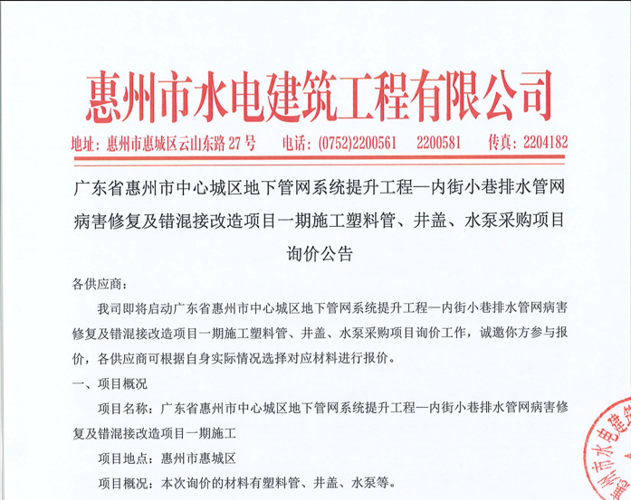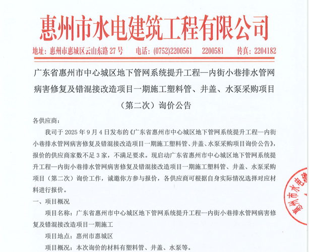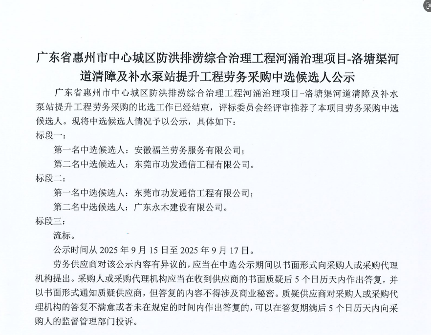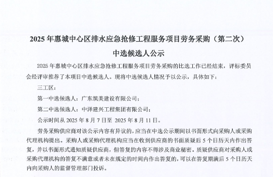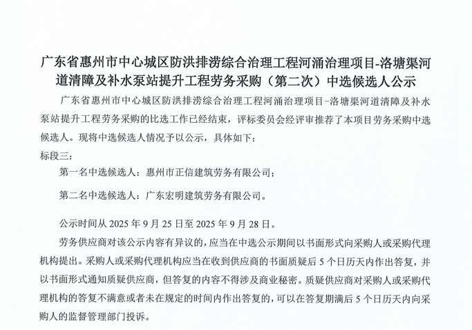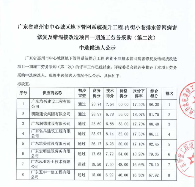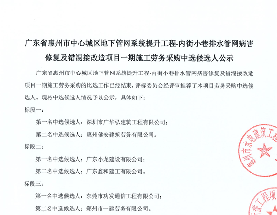 廣東省惠州市中心城區地下管網系統提升工程-內街小巷排水管網病害修復及錯混接改造項目一期施工勞務采購(第二次)中選候選人公示……